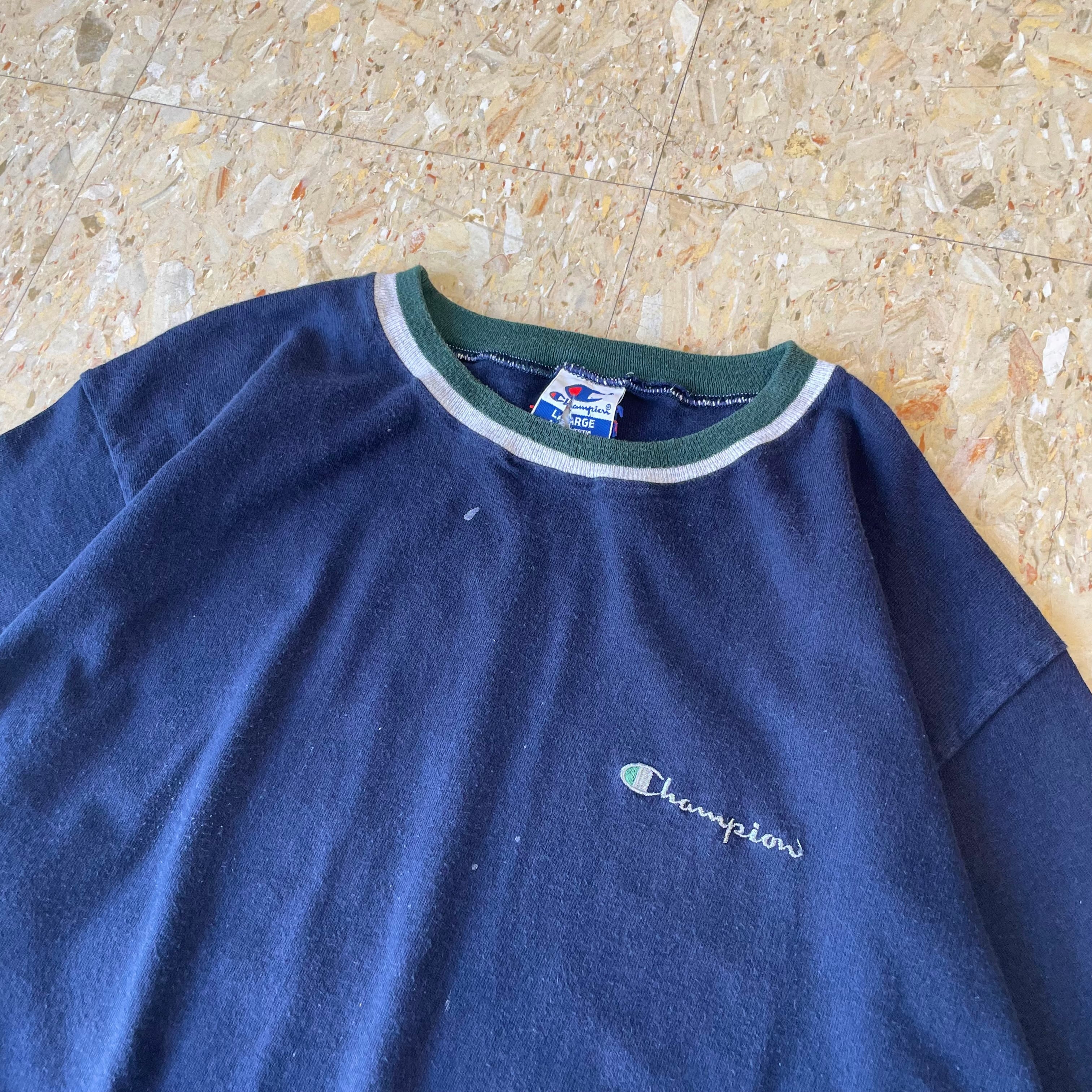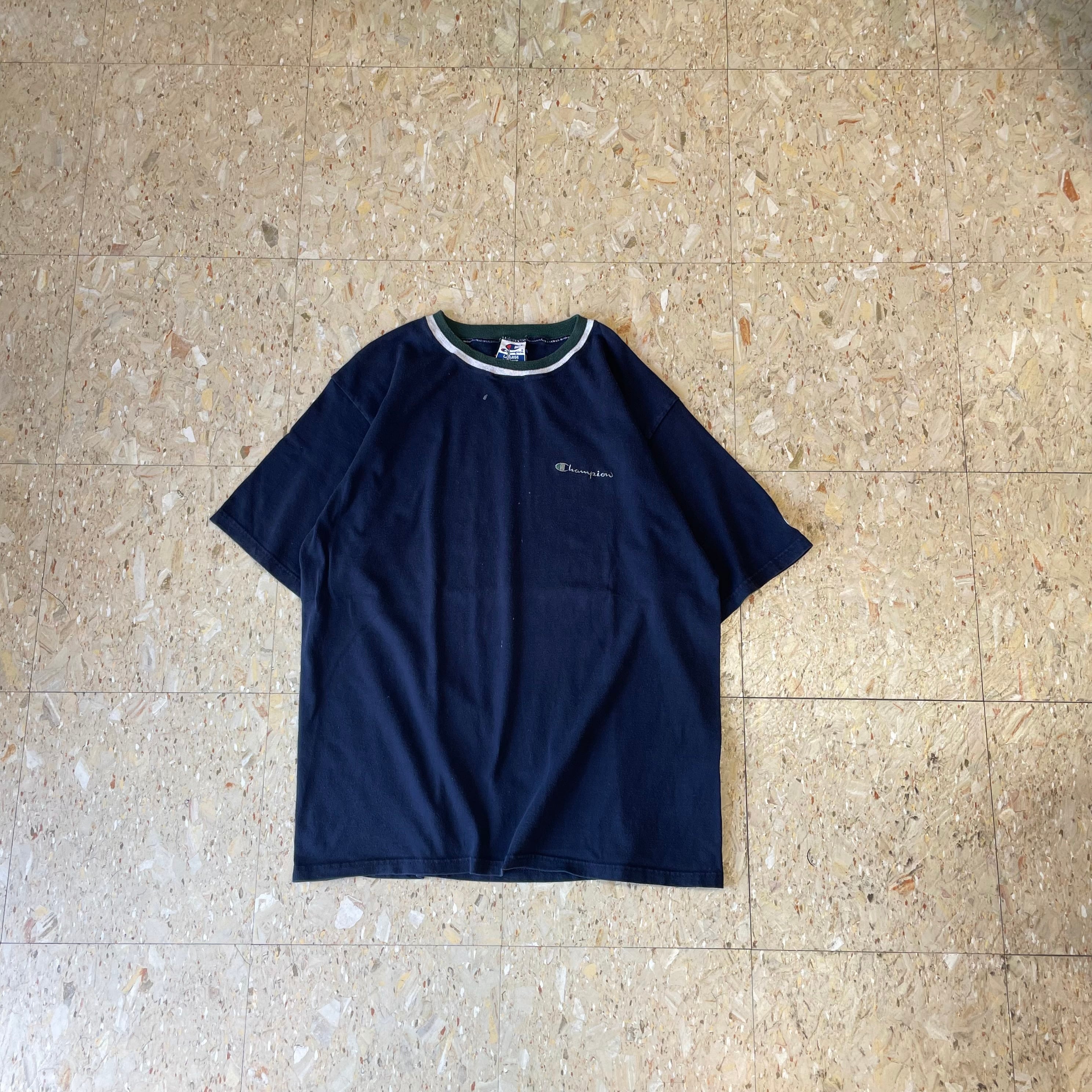 90s USA製 【Champion】 チャンピオン 青タグ ワンポイント Tシャツ リブライン ネイビー size.L